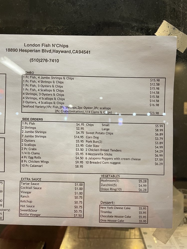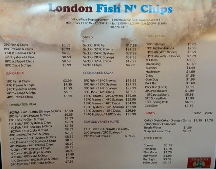 London Fish ‘N Chips, located in Hayward, CA, offers a nostalgic experience with their crispy fish and chips. Customers praise the generous portion sizes and friendly service, making it a solid spot for satisfying cravings. The menu includes various combinations, such as the Family Pak, Deep Fried Mushrooms, and Deep Fried Zucchini, all battered and fried to perfection. While not claiming to be the best fish ever, London Fish ‘N Chips delivers good quality and value for money. The slightly sweet batter, house-made tartar sauce, and malt vinegar add flavor to each bite. With convenient online ordering options and ample parking, this spot is a go-to for those seeking a mom-and-pop restaurant experience. Whether dining in or ordering takeout, London Fish ‘N Chips promises a delicious and satisfying meal.